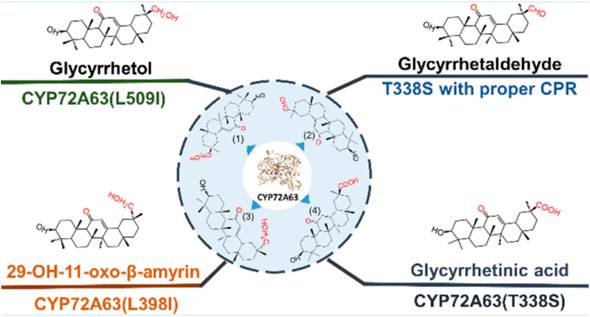 本文利用甘草中合成甘草次酸的P450單加氧酶CYP72A63基于同源建模與分子對接等技術(shù)進(jìn)行輔助理性設(shè)計,重塑其活性口袋以控制對于不同中間產(chǎn)物的契合度。通過提高甘草次醇的契合度實(shí)現(xiàn)了甘草次酸特異性合成,通過降低甘草次醇的契合度防止了其進(jìn)一步氧化實(shí)現(xiàn)了甘草次醇的特異性合成。通過控制C-29和C-30相對于血紅素鐵的相對位置,實(shí)現(xiàn)了對底物C-29的特異性氧化,進(jìn)一步通過CPR的匹配優(yōu)化首次實(shí)現(xiàn)了甘草次醛類中間產(chǎn)物的特異性合成。同時利用釀酒酵母的體內(nèi)驗(yàn)證方式解決了突變體體外試驗(yàn)難以進(jìn)行的問題。