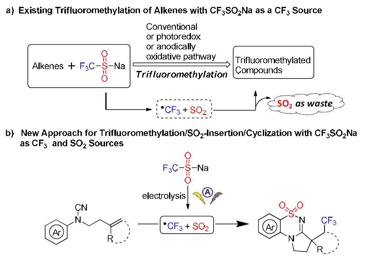 導讀:三氟甲基取代的有機氟化合物在醫(yī)藥、農藥、材料等領域具有廣泛應用。因此,發(fā)展高效、實用的合成方法制備三氟甲基取代的有機化合物具有重要的研究價值。Langlois試劑(CF3SO2Na)作為一類重要的三氟甲基化試劑,廣泛用于烯烴、芳烴等的三氟甲基化反應。然而,該類試劑僅作為三氟甲基給體,反應伴隨釋放的SO2作為反應廢棄物,并未被有效利用。