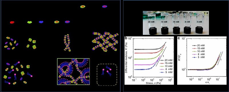 生物組織是由蛋白質(zhì)砌塊組裝得到的半柔性(Semiflexible)生物微絲交織而成的三維網(wǎng)絡(luò)結(jié)構(gòu),在應(yīng)對外界機械力的刺激時,會表現(xiàn)出獨特的應(yīng)變增強特性(Strain-stiffening),以保護機體免受外界應(yīng)力的傷害。長期以來,人們利用小分子砌塊,通過超分子組裝的方式,制備出了一系列類似生物組織的超分子水凝膠材料,并在生物醫(yī)藥、仿生、光電等領(lǐng)域表現(xiàn)出巨大的應(yīng)用前景。然而,生物組織所表現(xiàn)出的應(yīng)變增強特性在人工合成型超分子水凝膠材料中極其罕見。