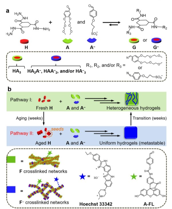 在該研究工作中,該團(tuán)隊(duì)發(fā)展了一種獨(dú)特的、利用分子老化誘導(dǎo)成核組裝的控制手段,實(shí)現(xiàn)了具有瞬態(tài)特性的超分子水凝膠材料的制備。研究人員在一前期構(gòu)筑的模塊化超分子組裝體系(Angew.Chem. Int.Ed. 2019, 58,3800; J. Am. Chem. Soc. 2019, 141, 2847)基礎(chǔ)上,發(fā)現(xiàn)通過(guò)對(duì)模塊分子進(jìn)行溫和的老化處理,即可誘導(dǎo)改變后續(xù)分子的組裝路徑,由自發(fā)條件下的親熱力學(xué)控制轉(zhuǎn)變?yōu)橛H動(dòng)力學(xué)控制,組裝形成一種獨(dú)特的亞穩(wěn)態(tài)超分子水凝膠材料。進(jìn)一步研究發(fā)現(xiàn),體系中的組裝前體分子在老化處理過(guò)程中,自組裝成納米級(jí)的聚集體,該聚集體作為成核中心,改變了分子組裝成核過(guò)程,誘導(dǎo)組裝過(guò)程轉(zhuǎn)變?yōu)橛H動(dòng)力學(xué)控制型,最終形成動(dòng)力學(xué)控制的超分子組裝產(chǎn)物。該超分子凝膠表現(xiàn)出獨(dú)特的瞬態(tài)特性,其結(jié)構(gòu)隨時(shí)間可進(jìn)行緩慢的演變,最終轉(zhuǎn)變?yōu)橄鄬?duì)穩(wěn)定的凝膠狀態(tài)。