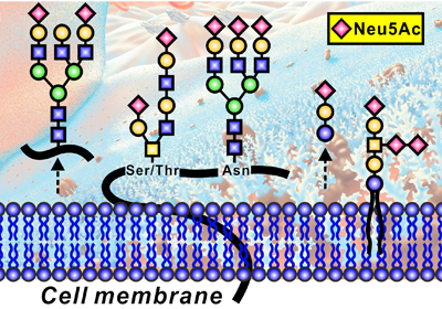 唾液酸糖鏈在細胞膜表面分布眾多,如同一層“糖被”覆蓋在細胞表面。唾液酸通常位于糖鏈的最外端,這種特殊的位置及其廣泛分布性,使得唾液酸糖鏈在病毒感染,免疫激活,癌癥發(fā)生、發(fā)展和遷移等諸多生理過程中,發(fā)揮著至關重要的作用。唾液酸糖蛋白已被廣泛用作癌癥的臨床生物標志物。然而,唾液酸糖鏈的鑒定及分析異常復雜,迫切需要全新、高效的材料學體系支撐,以攻克復雜生物樣本中唾液酸糖肽富集和分離的難題,推動糖蛋白組學的全面發(fā)展。