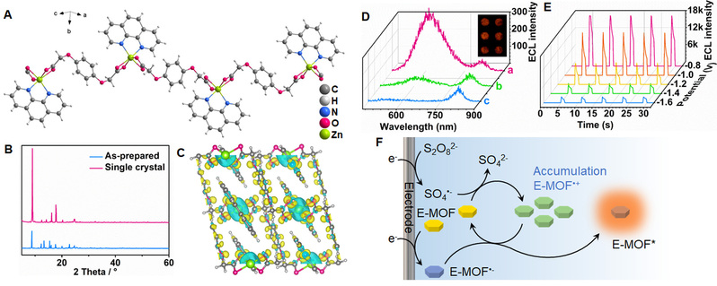 圖1.電活性金屬有機(jī)框架材料的晶體結(jié)構(gòu)與水相自增強(qiáng)電致化學(xué)發(fā)光