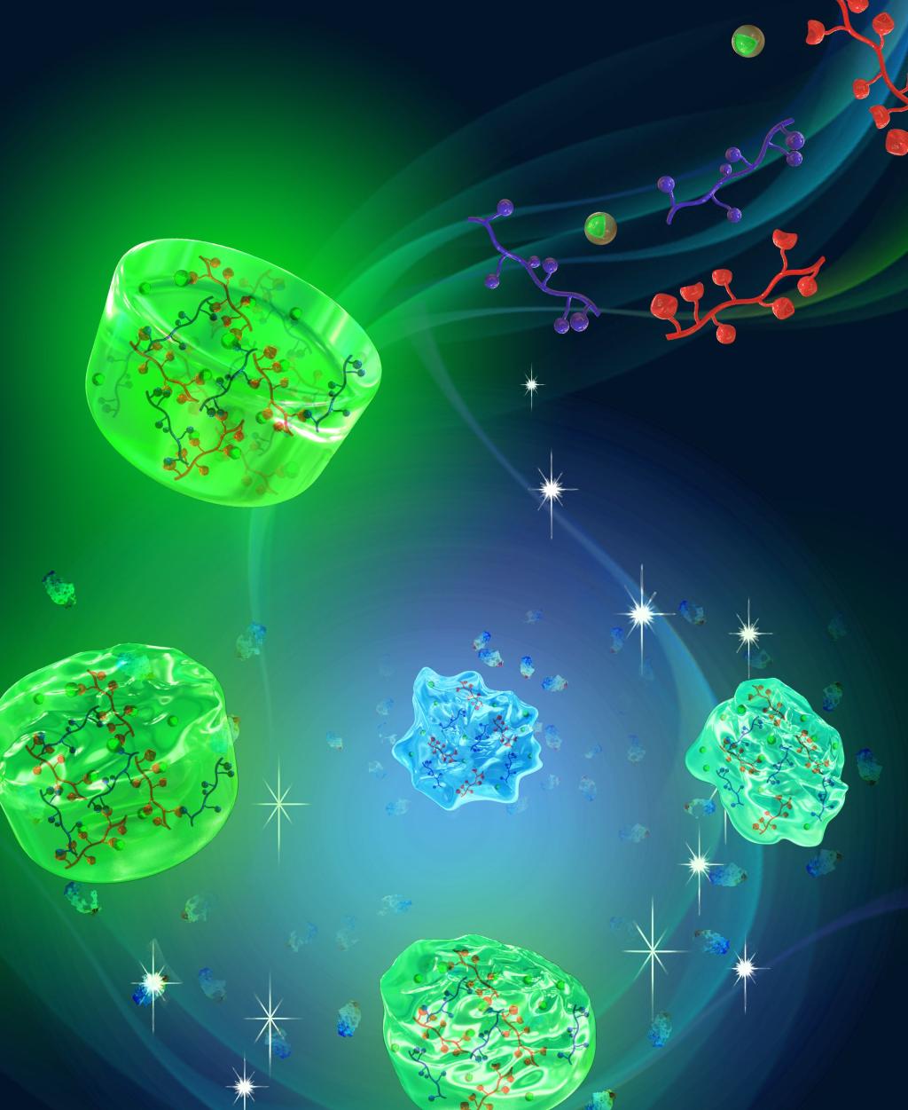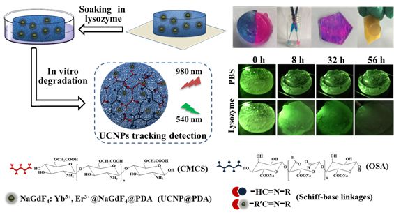 構(gòu)建具有熒光特性的工程化水凝膠材料,是凝聚態(tài)材料近年來的前沿。發(fā)表在Macromolecules 上的封面研究工作,制備了具有近紅外光激發(fā)的上轉(zhuǎn)換材料,NaGdF4:Yb3+,Er3+@NaGdF4,在該材料表面涂層以聚多巴胺,以修飾有聚多巴胺的上轉(zhuǎn)換納米顆粒和羧甲基殼聚糖為單體,以氧化海藻酸鈉為交聯(lián)劑,通過動態(tài)共價(jià)席夫堿交聯(lián)制備了強(qiáng)機(jī)械、自修復(fù)、可注射的生物相容凝聚態(tài)凝膠材,利用上轉(zhuǎn)換優(yōu)異的熒光性質(zhì)進(jìn)行了可視化熒光跟蹤降解,在組織工程等領(lǐng)域具有潛在的應(yīng)用價(jià)值。