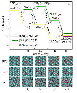 湖南大學(xué)材料科學(xué)與工程學(xué)院郭坤琨、袁定旺教授與四川省新材料研究中心王斌、程建麗研究員合作,利用第一性原理密度泛函理論(DFT)計(jì)算,首次研究了碳化鉬(Mo2C)作為Li-CO2電池陰極催化劑的反應(yīng)機(jī)理。根據(jù)前人的實(shí)驗(yàn)研究,設(shè)計(jì)了5條不同的反應(yīng)路徑,計(jì)算不同中間產(chǎn)物的吉布斯自由能變化,從中選擇了在三個(gè)碳化鉬(Mo2C)晶面的最優(yōu)反應(yīng)路徑,見圖1。系統(tǒng)研究了草酸鋰(Li2C2O4)和碳酸鋰(Li2CO3)成核過程中不同中間產(chǎn)物的吉布斯自由能變化,見圖2。理論結(jié)果也進(jìn)一步表明三個(gè)碳化鉬(Mo2C)晶面均抑制了草酸鋰(Li2C2O4)分解形成碳酸鋰(Li2CO3)的化學(xué)反應(yīng)。因此,這些研究從理論上證明了Li2C2O4可以作為最終放電產(chǎn)物被穩(wěn)定下來,從而阻止進(jìn)一步形成Li2CO3。利用Bader電荷分析研究了吸附在催化表面上的Li2C2O4的表面電荷分布,發(fā)現(xiàn)在Li2C2O4和Mo2C表面之間存在電子轉(zhuǎn)移。這些研究將促進(jìn)對(duì)Li-CO2電池中電化學(xué)過程的理解和認(rèn)識(shí),也為Li-CO2電池陰極催化劑的設(shè)計(jì)和優(yōu)化提供直接的理論指導(dǎo)。