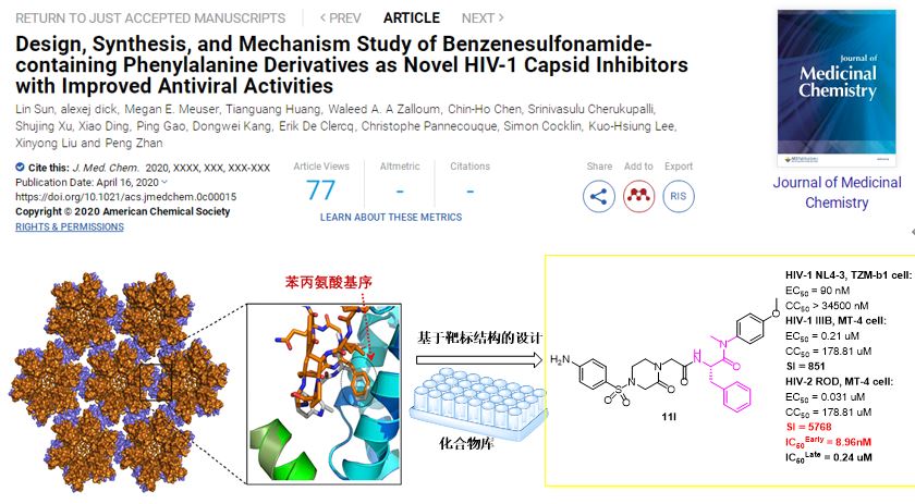 上述研究成果已在線發(fā)表于藥物化學領(lǐng)域國際頂尖期刊Journal of Medicinal Chemistry(J Med Chem. 2020 Apr 16. doi: 10.1021/acs.jmedchem.0c00015.),第一作者為山東大學藥學院在讀博士生孫林,劉新泳教授、展鵬副教授、北卡羅來納大學Kuo-Hsiung Lee教授及德雷克塞爾大學Simon Cocklin教授為本論文的共同通訊作者。目前,該成果已申請多項中國發(fā)明專利。