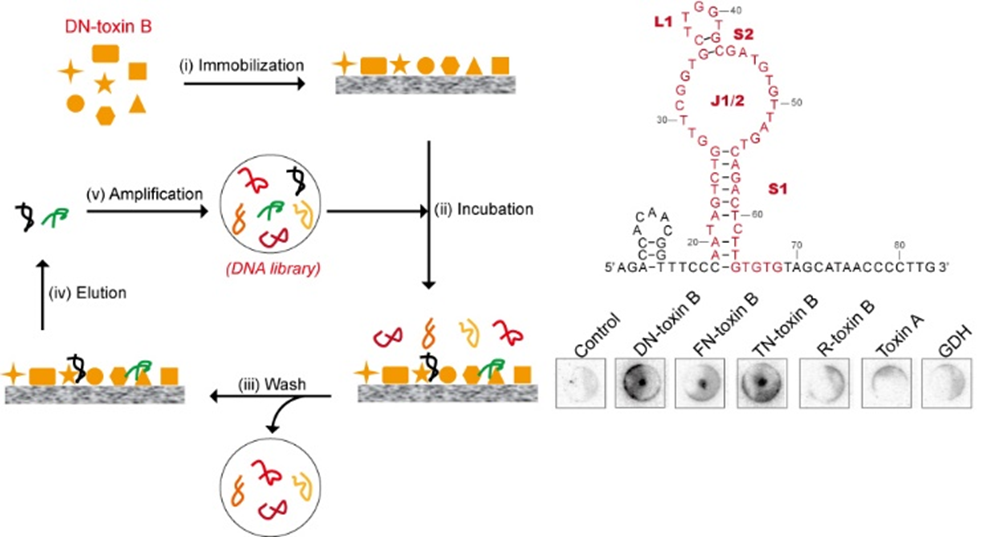 針對以上難點,大連理工大學劉猛課題組首先開發(fā)了新型核酸適配體體外篩選方法,得到了可以識別毒素B降解片段(DN-toxin B)的適配體,兩者的結合能力在nM級別。此外,該適配體可以結合天然毒素B(FN-toxin B)和熱處理的毒素B(TN-toxin B),對于重組型毒素B(R-toxin B)、毒素A(toxin A)和谷氨酸脫氫酶(GDH)等表現(xiàn)出良好的選擇性。進一步研究發(fā)現(xiàn),適配體識別的毒素B降解片段的分子量在50 kDa左右。