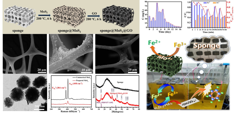 為了克服上述挑戰(zhàn),邢明陽教授研究團(tuán)隊采用簡單的浸漬-加熱的化學(xué)方法,開發(fā)了三維硫化鉬(3D-MoS2海綿)助催化(類)芬頓反應(yīng)體系,實現(xiàn)了對染料類及抗生素類廢水的高效處理。與傳統(tǒng)芬頓體系及已報道的助催化(類)芬頓體系相比,其優(yōu)勢表現(xiàn)為:三維結(jié)構(gòu)優(yōu)化AOPs性能優(yōu)勢。以Fe3+/H2O2體系為例,3D-MoS2海綿的引入,可使其降解芳香族有機(jī)污染物的反應(yīng)速率常數(shù)提高到原來的52倍;助催化反應(yīng)中心減少鐵的用量,降低生成鐵泥的風(fēng)險。3D-MoS2海綿中納米花片層堆積和不規(guī)則邊緣可以提供更多的Mo4+活性位點,加速Fe3+/Fe2+的循環(huán),抑制鐵泥等二次污染物的形成;運(yùn)行成本低,實現(xiàn)大規(guī)模高效處理抗生素廢水。3D-MoS2/Fe2+/PMS體系只需一次性加入鐵離子(20mg/L硫酸亞鐵),即可實現(xiàn)連續(xù)高效處理140L高濃度磺胺嘧啶廢水(120mg/L),其降解率可達(dá)97.87%。該體系可穩(wěn)定運(yùn)行16天以上,且其處理1噸廢水的運(yùn)行成本僅為0.33美元,使其具有巨大的工業(yè)應(yīng)用價值。