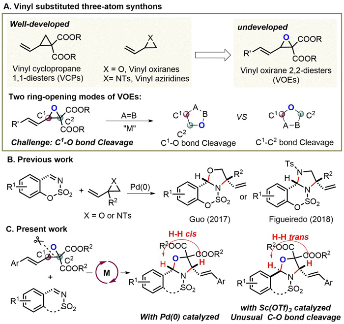 近日,在國(guó)家自然科學(xué)基金、廣西自然科學(xué)基金、廣西天然高分子化學(xué)與物理重點(diǎn)實(shí)驗(yàn)室和八桂學(xué)者團(tuán)隊(duì)的支持下,我校青年教師肖軍安博士為第一作者,蘇煒教授和中南大學(xué)陽(yáng)華教授為并列通訊作者的研究成果刊發(fā)于SCIENCE CHINA Chemistry《中國(guó)科學(xué):化學(xué)(英文版》。研究設(shè)計(jì)合成了一類新型三元張力環(huán)合成砌塊并將之應(yīng)用于可控開(kāi)環(huán)[3+2]-環(huán)加成反應(yīng)中,以高產(chǎn)率和極高的非對(duì)映異構(gòu)體選擇性分別得到了兩種不同的異構(gòu)體-氫-氫順式環(huán)加成產(chǎn)物和氫-氫反式加成產(chǎn)物。這一工作開(kāi)發(fā)了一類高立體選擇性獲得兩種不同非對(duì)映異構(gòu)體的策略,成功解決了可控張力環(huán)開(kāi)環(huán)[3+2]-環(huán)化反應(yīng)難題,對(duì)于合成化學(xué)領(lǐng)域具有重要意義。