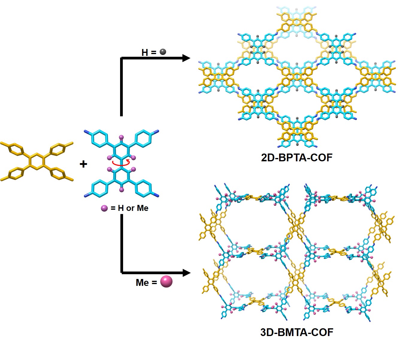 前期研究中,汪成課題組提出了“4+4”連接方式來構筑三維COFs的拓撲設計新策略。本文中,他們通過增加空間位阻將平面型分子扭轉成四面體的策略,采用“4+4”連接方式,利用取代基不同的聯(lián)苯基前體合成了具有不同維度的兩種COFs(2D-BPTA-COF和3D-BMTA-COF)。由結構解析得知,2D-BPTA-COF為層狀堆積結構,聯(lián)苯的二面角為~ 0?;當在聯(lián)苯鄰位引入位阻較大的甲基后,其二面角變?yōu)閪 60?,3D-BMTA-COF具有為五重互鎖pts結構。此結構表明,通過增加位阻可將前體分子從平面型扭轉成四面體構型,進而構筑3D COFs,為后續(xù)豐富三維COFs的結構多樣性提供了一種新思路。