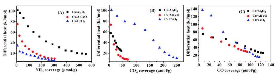 圖1.Cu/Al2O3、Cu/AlCeO和Cu/CeO2催化劑對(duì)NH3(A)、CO2(B)和CO(C)的吸附量熱數(shù)據(jù)