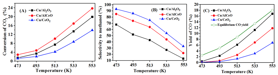 Al2O3表面主要呈酸性,CeO2表面主要呈堿性,采用共沉淀法制備了3種表面不同酸堿性的Cu基催化劑,分別為Cu/Al2O3、Cu/CeO2和Cu/AlCeO (Cu/CeO2/Al2O3),表面酸堿位強(qiáng)度及數(shù)量用吸附量熱進(jìn)行了表征(圖1(A)和(B))。隨著載體中CeO2含量的增加,催化劑表面堿性明顯增強(qiáng)。圖2是3種所制備催化劑對(duì)CO2催化加氫的性能數(shù)據(jù)。研究結(jié)果表明,強(qiáng)表面堿性有利于增強(qiáng)甲醇的選擇性。原因可能是強(qiáng)表面堿性增強(qiáng)CO在催化劑表面的吸附,抑制逆水汽反應(yīng),進(jìn)而提高了甲醇的選擇性(圖1C)。同時(shí),適量增加Al2O3的含量,有利于Cu粒子分散,Cu顆粒的高分散有利于CO2催化活性的提高。最終,Cu/AlCeO催化劑獲得了最優(yōu)的催化CO2加氫制甲醇性能,CO2轉(zhuǎn)換率在553K時(shí)達(dá)到23.7%,甲醇選擇性在473K時(shí)達(dá)到85%,甲醇產(chǎn)率在533K時(shí)達(dá)到7.4%。(Catalysis Today, 2020, 339, 352-361. (ESI高被引論文))