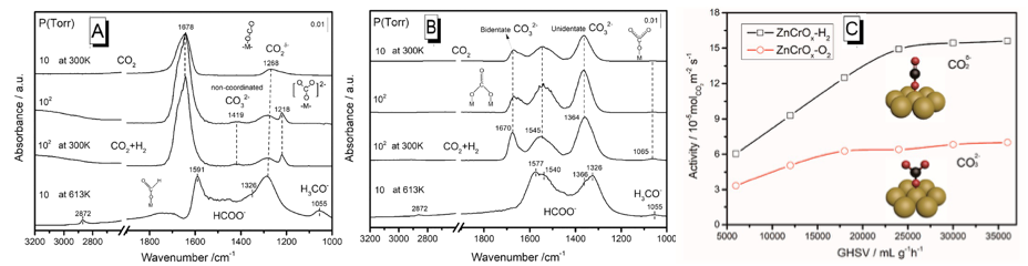 圖4. (A)ZnCrOx-H2和(B)ZnCrOx-O2樣品的原位漫反射紅外光譜圖(測(cè)試前樣品在20vol.%H2/N2氣氛下350 oC處理1小時(shí),然后樣品在特定壓力和溫度下經(jīng)CO2或CO2和H2混合氣吹掃后進(jìn)行測(cè)試);(C) ZnCrOx-H2和ZnCrOx-O2樣品上CO2加氫活性圖。