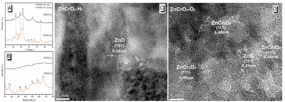 圖3. ZnCrOx-H2和ZnCrOx-O2樣品的XRD(A)、Raman圖譜(B)和高分辨透射電鏡圖(C,D)