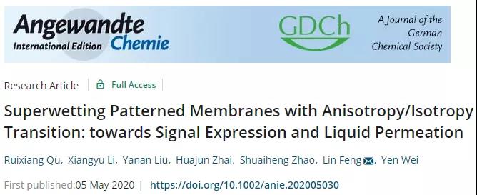 近日,馮琳副教授、危巖教授團隊在著名期刊《德國應化》上介紹了一種具有SiO2 /十八烷基胺(ODA)涂層的圖案化多功能響應型超潤濕膜。膜的涂覆部分在不同的pH值下顯示出超疏水性(pH=7)/超親水性(pH<2或pH>13)轉(zhuǎn)變,未涂覆的部分保持超親水性,從而使膜具有各向異性/各向同性的潤濕性轉(zhuǎn)變性質(zhì)。該膜既可以用作響應型滲透膜,也可以用作信號表達,能以較好的分離效率(> 99.90%)和通量(~60 L/m2·h)實現(xiàn)液體的分離和滲透,以及實時可變信號的表達。