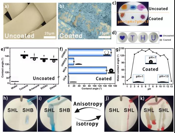 圖2. 膜的形態(tài)和潤濕行為。a)未涂覆部分的FESEM圖像; b)涂覆部分的FESEM圖像; c)制備的膜的pH響應特性; d)由涂層衍生出的“l(fā)ove THU”圖案; e)未涂覆部分的WCA和水下OCA; f)涂覆部分的WCA、OCA、水下OCA和油下WCA; g)不同pH值下涂覆部分的水接觸角。h)-k)在pH誘導下各向異性和各向同性之間的轉(zhuǎn)變。SHL,超親水。SHB,超疏水。