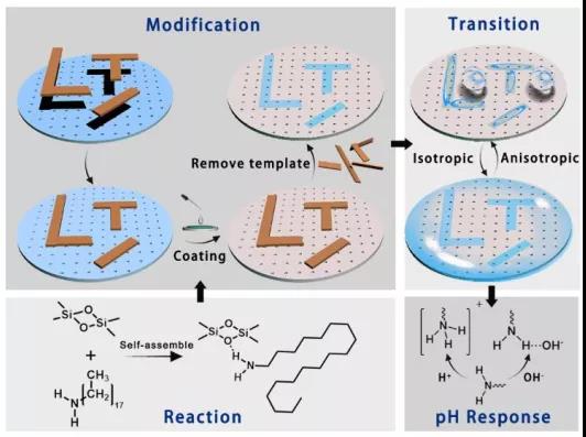 圖1. 膜的制造和響應。以各種形狀的模板為基礎,采用涂覆法制備膜。采用一步氫鍵自組裝法制備了該涂層。由于所制備的膜具有活性的氨基和可調(diào)節(jié)的圖案,使其表現(xiàn)出各向異性/各向同性的潤濕性轉(zhuǎn)變特性,從而實現(xiàn)了功能的多樣性。