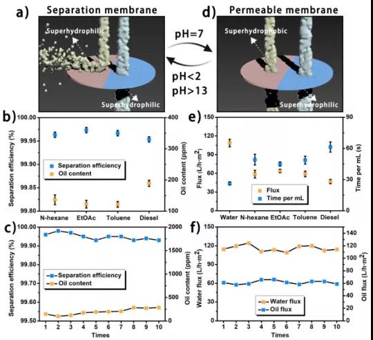 圖3. 由各向異性/各向同性轉(zhuǎn)變得到的響應性滲透膜。a)pH<2或pH>13時,膜可作為選擇性分離膜; b)分離效率和濾液的含油量; c)油水分離的可重用性; d)pH=7時,膜可作為非選擇性滲透膜; e)通過膜的不同液體的流量; f)液體滲透的可重用性。