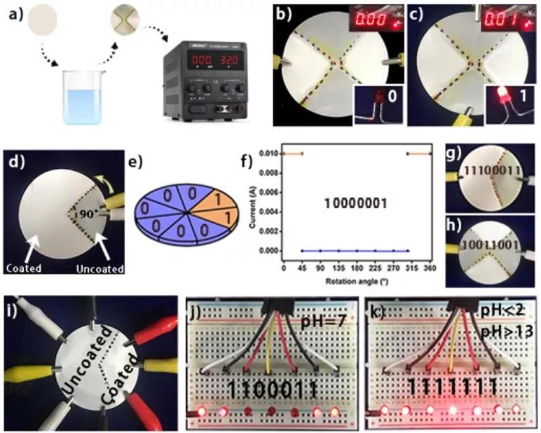 圖4. 由各向異性/各向同性轉(zhuǎn)變得到的信號表達。a)模擬處理導電液體后情況的預處理; b)-c)電流值和LED所體現(xiàn)的信號; d)-f)具有90°扇形圖案的膜表示的二進制序列; g)-h)表達二進制序列膜的其他例子; i)-k)LED陣列所體現(xiàn)的pH響應信號變化。