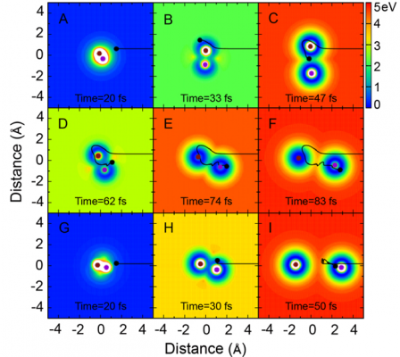 H + HD → H2 +D反應(yīng)散射的軌線示意動畫,其中的黑色曲線代表進攻 H 原子的運動軌跡。