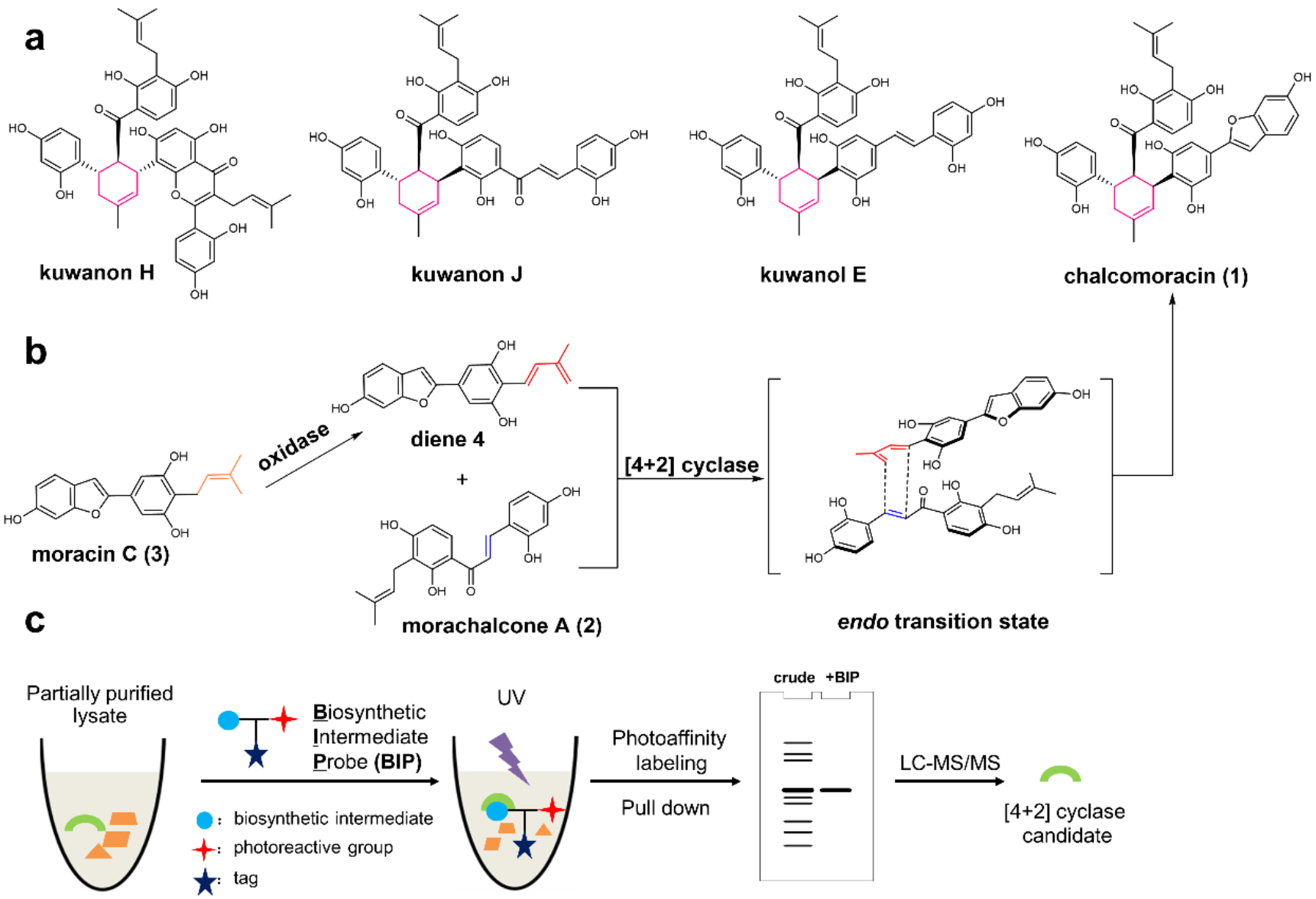 植物天然產(chǎn)物作為內(nèi)源性小分子參與了自身重要生理活動(dòng),例如調(diào)控植物自身的生長(zhǎng)發(fā)育以及抵御病蟲害, 同時(shí)也是治療人類重大疾病的創(chuàng)新藥物分子的主要來(lái)源。因此,解析植物天然產(chǎn)物的生物合成途徑對(duì)于植物生物學(xué)、生態(tài)學(xué)研究、以及開發(fā)創(chuàng)新藥物治療人類重大疾病都具有重要意義。然而由于植物自身的特點(diǎn)(生長(zhǎng)緩慢,基因組龐大)以及參與生物合成的基因往往不成簇分布的現(xiàn)象,植物天然生物合成研究方法有限,進(jìn)展緩慢。在本文中,雷曉光課題組開發(fā)出一種基于天然生物合成中間體分子探針(Biosynthetic Intermediate Probes, BIPs)的靶標(biāo)垂釣策略(如圖1所示),并與合作者一起通過(guò)結(jié)合植物天然產(chǎn)物生物合成研究中的常規(guī)手段(活性導(dǎo)向蛋白分離以及轉(zhuǎn)錄組測(cè)序等方法),成功在桑樹愈傷組織中鑒定出兩個(gè)FAD依賴蛋白(MaMO和MaDA),其中MaDA被進(jìn)一步證明為自然界中存在的首個(gè)催化分子間Diels-Alder反應(yīng)的單功能酶。該基于“天然產(chǎn)物生物合成中間體分子探針”的化學(xué)生物學(xué)研究策略,為解析植物天然產(chǎn)物生物合成途徑提供了新的研究思路。