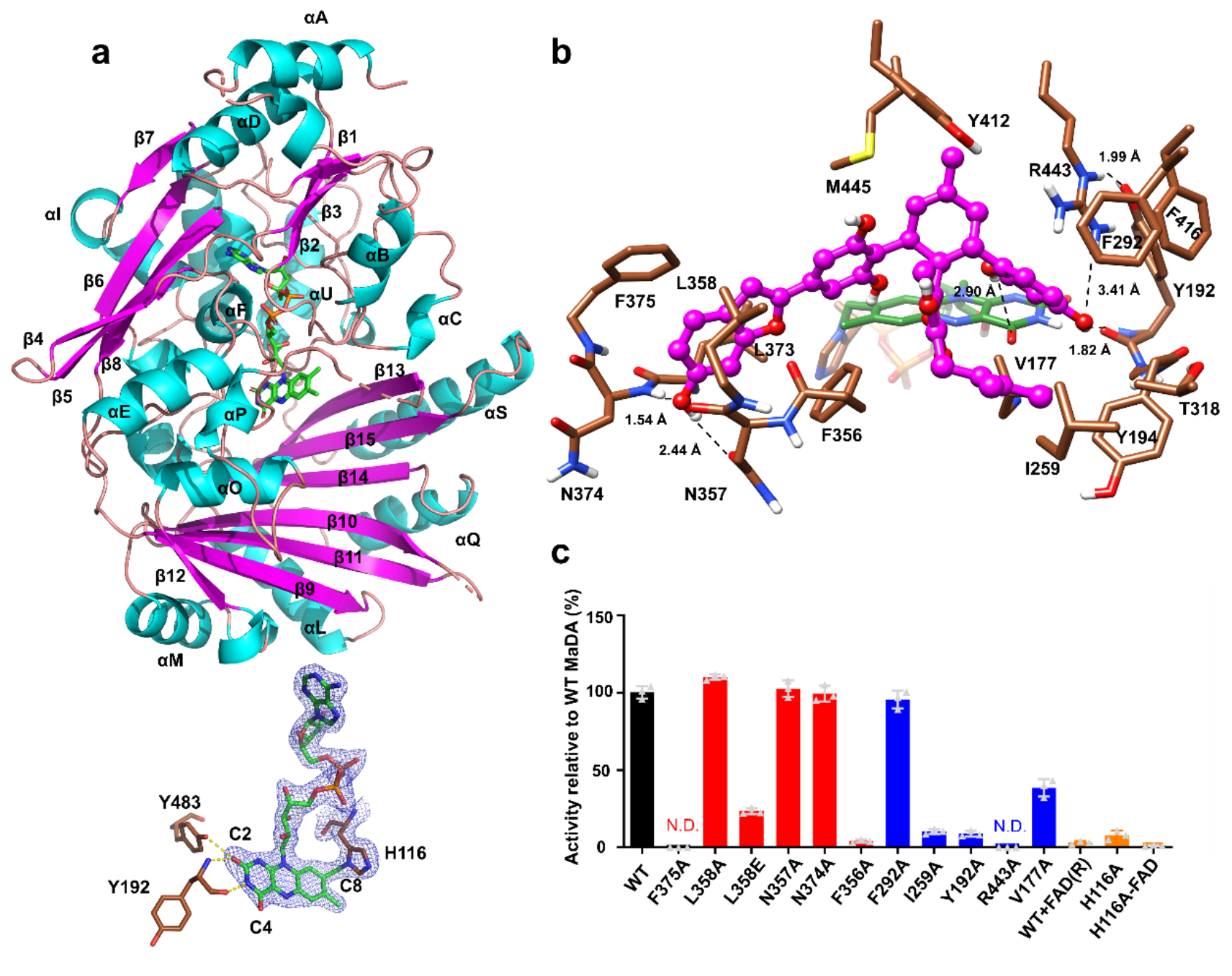 在成功鑒定出MaDA后,作者進(jìn)一步探索了其底物適應(yīng)性,并對(duì)該酶促分子間Diels-Alder反應(yīng)的機(jī)理進(jìn)行了深入探討。作者通過(guò)DFT計(jì)算證明了該非酶促的Diels-Alder反應(yīng)是通過(guò)協(xié)同但不同步的反應(yīng)機(jī)理進(jìn)行的。隨后通過(guò)對(duì)該酶促分子間Diels-Alder反應(yīng)進(jìn)行KIE實(shí)驗(yàn),驗(yàn)證了該酶促反應(yīng)過(guò)程是通過(guò)協(xié)同但不同步的反應(yīng)機(jī)理進(jìn)行的,這證明了MaDA是真正意義上的單功能分子間Diels-Alder反應(yīng)酶。為了進(jìn)一步探索MaDA的催化機(jī)制,雷曉光課題組成功解析了MaDA的晶體結(jié)構(gòu)(2.3 ?),在此基礎(chǔ)上,進(jìn)行了分子對(duì)接以及定點(diǎn)突變實(shí)驗(yàn)。結(jié)果顯示,F375,R443,F356,I259以及Y192對(duì)于維持MaDA的活性至關(guān)重要,同時(shí),作者還發(fā)現(xiàn)氧化態(tài)的FAD對(duì)于MaDA的活性也非常重要,如圖2所示。