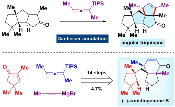 翟宏斌課題從三甲基環(huán)戊烯酮出發(fā),基于Danheiser [3+2]環(huán)化的合成策略,開(kāi)發(fā)出一條簡(jiǎn)潔、高效及實(shí)用的不對(duì)稱(chēng)全合成路線,線性步驟為14-17步。關(guān)鍵步驟包括HAT烯-氰環(huán)化,串聯(lián)的Nicholas/Pauson-Khand反應(yīng)及Danheiser環(huán)戊烯環(huán)化。該反應(yīng)路線的原子經(jīng)濟(jì)性較高,化學(xué)選擇性較好,很多中間體也可進(jìn)行克級(jí)規(guī)模的制備。該工作為進(jìn)一步研究cyclopiane類(lèi)天然產(chǎn)物的生物活性提供了有力的支持,而且為運(yùn)用Danheiser [3+2]環(huán)化合成復(fù)雜天然產(chǎn)物具有重要的借鑒意義。