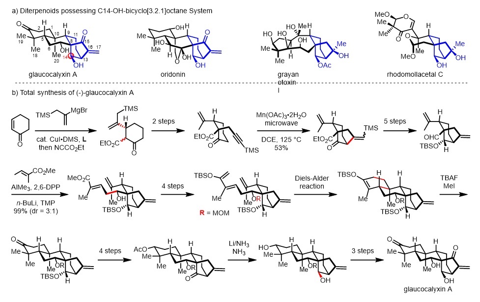 二萜類天然產(chǎn)物由于具有復雜的化學結(jié)構(gòu)和良好的生物活性,其全合成一直是合成化學的熱門研究領(lǐng)域。然而,具有14-羥基[3.2.1]橋環(huán)結(jié)構(gòu)的二萜(圖a),由于其連續(xù)手性中心多、合成挑戰(zhàn)性更高,而鮮有全合成報道。藍萼甲素(Glaucocalyxin A)則是該類二萜的代表分子之一,其不僅具有良好的抗腫瘤與抗炎活性,而且結(jié)構(gòu)復雜,包含四個全碳環(huán)和7個連續(xù)的手性中心,至今沒有全合成報道。