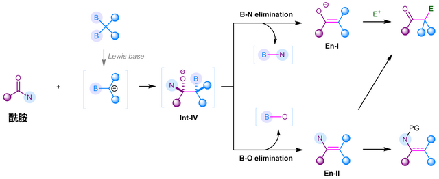 最近,該團隊基于前期烷基偕二硼的合成(J. Am. Chem. Soc. 2017, 139, 5257;Org. Chem. Front. 2019, 6, 900;Chin. J. Org. Chem. 2019, 39, 3438)以及轉(zhuǎn)化(Angew. Chem. Int. Ed. 2018, 57, 5501)的研究基礎(chǔ),進一步利用偕二硼實現(xiàn)酰胺的多樣性轉(zhuǎn)化。研究發(fā)現(xiàn),一級酰胺、二級酰胺和三級內(nèi)酰胺經(jīng)過B-O消除過程得到烯胺中間體;而三級酰胺則經(jīng)過B-N消除得到烯醇中間體。通過對這些中間體的不同捕獲方式,分別合成了α-官能化酮、β-氨基酮、烯酰胺、β-酮酰胺、γ-酮酰胺以及α-烷基化三級環(huán)內(nèi)胺類化合物(圖2)。