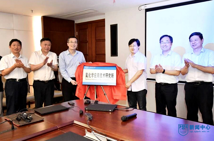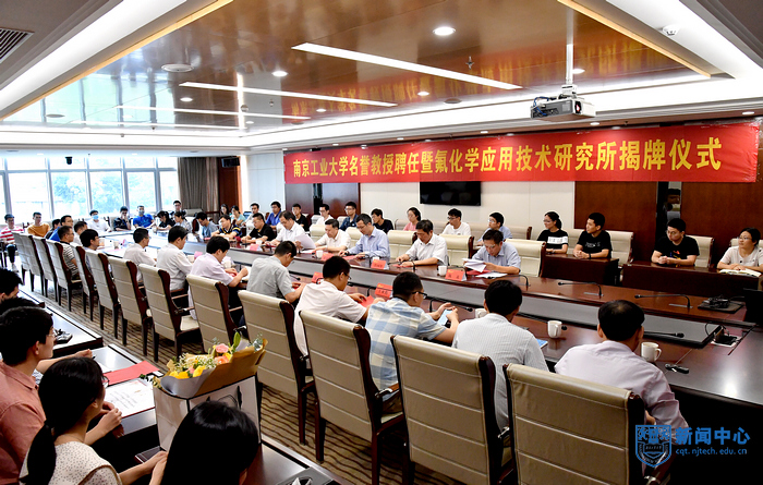 科學(xué)研究部部長管國鋒宣讀“關(guān)于成立南京工業(yè)大學(xué)氟化學(xué)應(yīng)用技術(shù)研究所的決定”,胡金波教授和發(fā)起人、化學(xué)學(xué)院馮超教授共同為研究所揭牌。