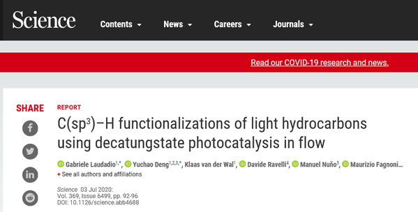 7月3日,上??萍即髮W(xué)物質(zhì)學(xué)院2017級(jí)研究生鄧宇超以共同第一作者身份,在國際知名學(xué)術(shù)期刊《科學(xué)》(Science)上在線發(fā)表了題為“C(sp3)–H functionalizations of light hydrocarbons using decatungstate photocatalysis in flow”的科研成果。這是上??萍即髮W(xué)物質(zhì)學(xué)院繼今年4月《自然》(Nature)、5月《科學(xué)》(Science)之后的又一項(xiàng)頂尖科研進(jìn)展。