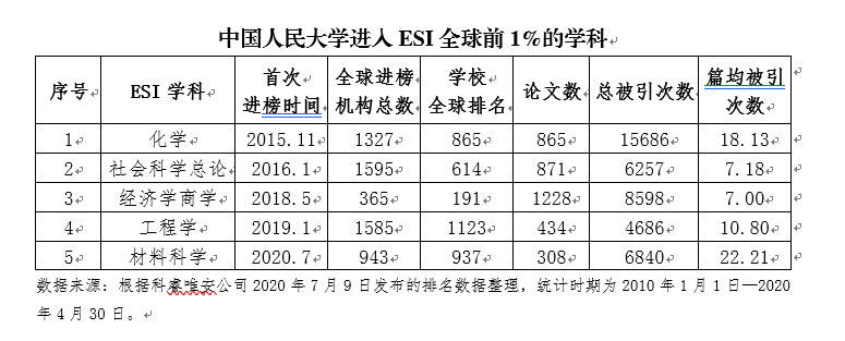 至此,中國人民大學已有5個ESI學科進入全球前1%,包括2個人文社會科學學科:社會科學總論、經(jīng)濟學商學,3個理工學科:化學、工程學、材料科學,標志著學校在這些學科領(lǐng)域的科學研究水平已邁進世界一流行列。
