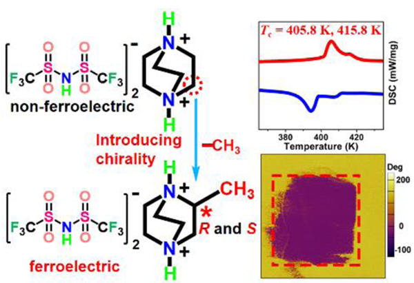 手性和鐵電性之間的淵源可以追溯到1920年第一個(gè)鐵電體的發(fā)現(xiàn),即含有酒石酸根手性離子的羅息鹽。在分子材料的構(gòu)筑過程中,只有單一手性分子的參與才能有效保證非中心對(duì)稱晶格的形成。明星分子Dabco集中了非常多的鐵電課題,諸多科研人員多年持續(xù)圍繞其開展鐵電研究。通常,理論上認(rèn)為手性化后的Dabco分子更加容易成為潛在的鐵電體。如Dabco甲基化等,但是實(shí)際上非常奇怪和特殊,一直以來科研人員嘗試的甲基化等手性修飾后的Dabco全部以失敗告終,一直沒有實(shí)現(xiàn)手性Dabco的鐵電特性,難度非常大。我們首次成功解決了這個(gè)難題。這為明星鐵電分子Dabco的衍生和拓展出更多的優(yōu)異特性鐵電材料提供了非常有幫助的策略。該成果被編委會(huì)在WileyChem’s Wechat platform介紹(chemistry news outlet in China)。從實(shí)驗(yàn)上再次驗(yàn)證了手性化鐵電設(shè)計(jì)策略的高概率和鐵電理論。