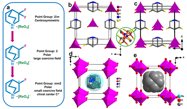 鐵電具有的獨(dú)特的光、電、力、熱等性質(zhì),吸引了科學(xué)和工業(yè)界的廣泛興趣。目前,陶瓷主導(dǎo)了諸多電子陶瓷行業(yè),從非易失性存儲(chǔ)器(NVM)到壓電聲納或超聲換能器。無機(jī)鐵電材料的極化可以在多個(gè)方向上重新定向,使得它們可以制作成陶瓷和薄膜等器件。這為分子鐵電材料的發(fā)展和研究提供了很多靈感,近幾十年來分子鐵電材料得到了快速地發(fā)展。然而,如何讓分子鐵電材料在多晶樣品狀態(tài)下表現(xiàn)出宏觀鐵電性,從而具有更優(yōu)越的應(yīng)用潛力,是具有挑戰(zhàn)的探索工作。對(duì)于促進(jìn)器件化應(yīng)用和多學(xué)科前沿交叉具有重要的意義。