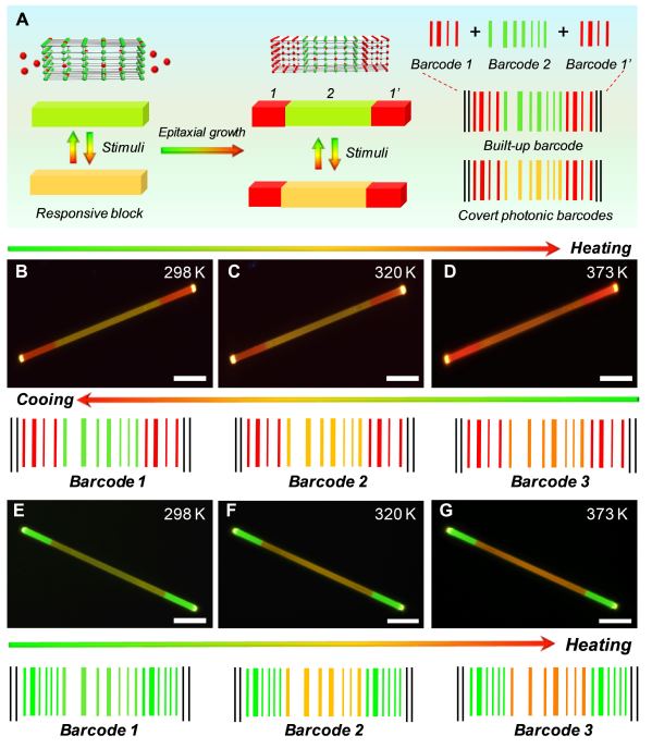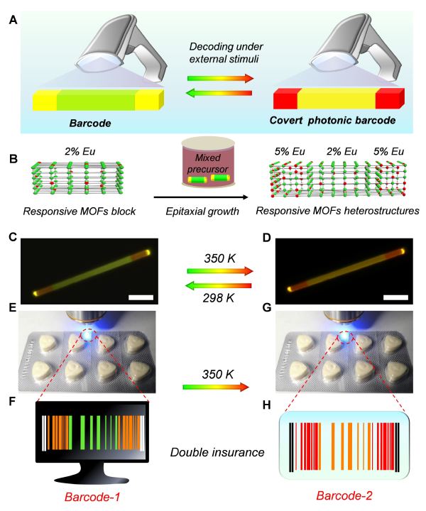 文章首次構(gòu)筑了具有空間響應(yīng)的鑭系金屬有機(jī)框架化合物(MOFs)微納多色異質(zhì)結(jié)構(gòu),利用異質(zhì)外延的方法精準(zhǔn)可控制備了多色復(fù)合一維鑭系MOFs異質(zhì)結(jié),不同異質(zhì)區(qū)域展現(xiàn)出的不同的發(fā)光特征以及鑭系離子特有的銳利發(fā)射峰構(gòu)成了MOFs異質(zhì)結(jié)構(gòu)的指紋信息。創(chuàng)新性的對(duì)這些易于分辨光譜進(jìn)行編碼,從而更自動(dòng)、方便地識(shí)別該微納結(jié)構(gòu)。通過(guò)進(jìn)一步熱刺激調(diào)控異質(zhì)區(qū)域中不同鑭系離子之間的能量轉(zhuǎn)移過(guò)程,對(duì)每個(gè)異質(zhì)模塊的發(fā)光顏色進(jìn)行獨(dú)立有效控制,首次實(shí)現(xiàn)了具有空間響應(yīng)的多色微納異質(zhì)結(jié)構(gòu)。這種獨(dú)特的空間智能響應(yīng)性可以進(jìn)一步設(shè)計(jì)隱藏性的光子學(xué)條形碼,在安全標(biāo)簽防偽領(lǐng)域具有巨大的應(yīng)用潛力。