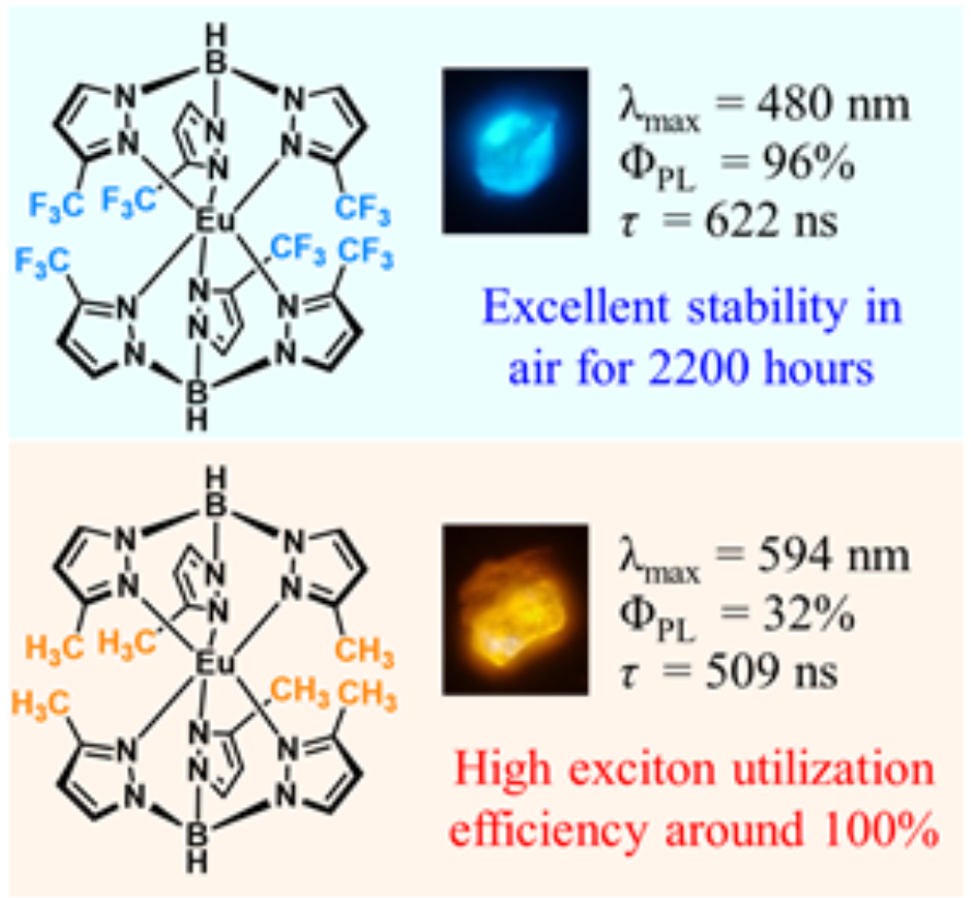 導(dǎo)讀:近日,北京大學(xué)化學(xué)與分子工程學(xué)院黃春輝課題組劉志偉副教授等提出并證明了具有d-f允許躍遷特性的稀土Eu(II)配合物可以通過(guò)合理的分子結(jié)構(gòu)設(shè)計(jì)實(shí)現(xiàn)高空氣/熱穩(wěn)定性和高發(fā)光效率,以及這類材料應(yīng)用于OLEDs時(shí)具有接近100%的激子利用率和高亮度下較低的效率衰減。