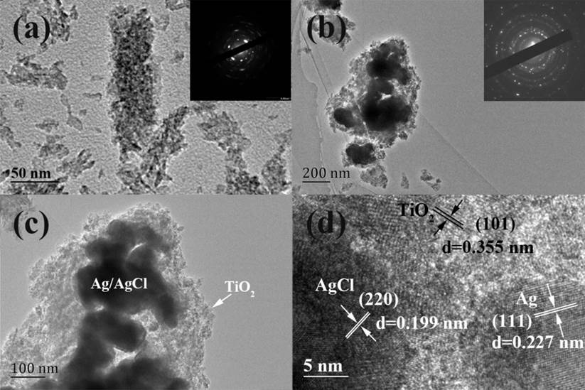 圖1 制備樣品的TEM照片: (a) Ti3+-TiO2介晶; (b-d) Ag/AgCl@Ti3+-TiO2復(fù)合材料