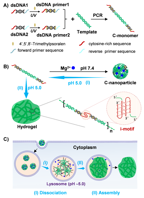 圖1.通過DNA動(dòng)態(tài)組裝構(gòu)建類細(xì)胞器DNA凝膠結(jié)構(gòu)。A)C-DNA構(gòu)建基元合成示意圖。B)DNA動(dòng)態(tài)變構(gòu)示意圖。C)細(xì)胞內(nèi)溶酶體酸性環(huán)境誘導(dǎo)DNA納米顆粒動(dòng)態(tài)變構(gòu)形成類細(xì)胞器示意圖。