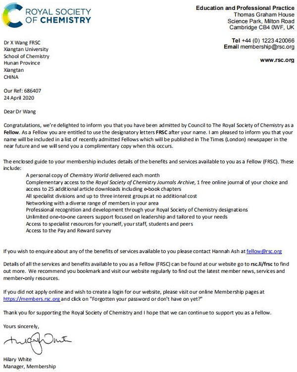 英國皇家化學(xué)學(xué)會(huì)(Royal Society of Chemistry)成立于1841年,是世界上歷史最悠久的化學(xué)學(xué)術(shù)團(tuán)體,國際上最有影響的學(xué)會(huì)之一,國際權(quán)威的學(xué)術(shù)機(jī)構(gòu)。根據(jù)專家推薦,學(xué)會(huì)每年遴選英國及國際上在化學(xué)科學(xué)研究領(lǐng)域取得出色成就和為推動(dòng)化學(xué)科學(xué)發(fā)展做出卓越貢獻(xiàn)的科學(xué)家為其會(huì)士。