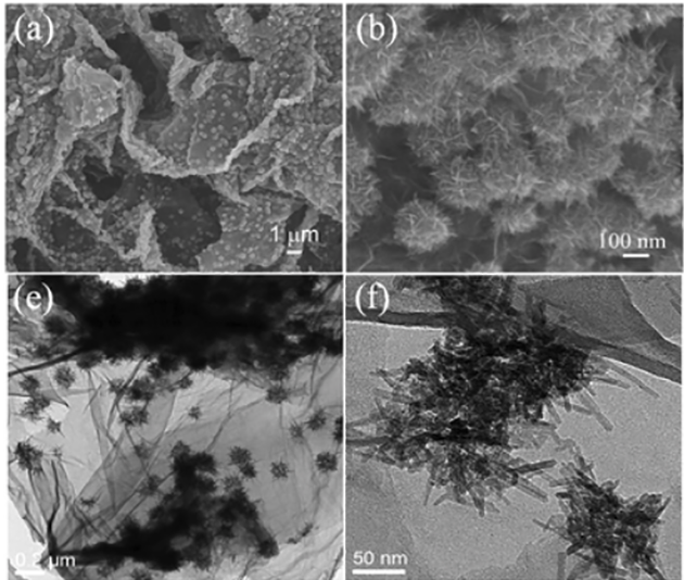 圖2. 復(fù)合材料實例--石墨烯-二氧化錳三維多孔復(fù)合材料。2a,b為掃描電鏡圖,2e,f為復(fù)合材料的透射電鏡圖。