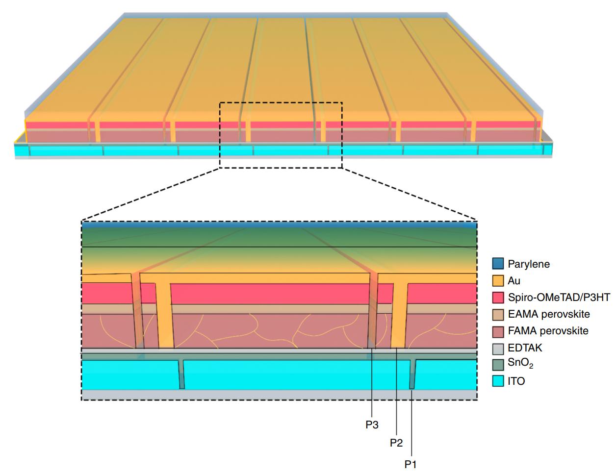 圖1 基于系統(tǒng)界面工程的高效高穩(wěn)定鈣鈦礦太陽能模組結(jié)構(gòu)及界面示意圖。