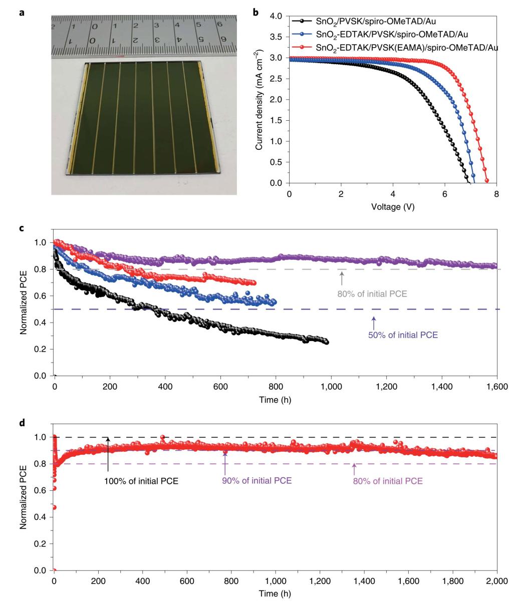針對上述問題,該研究通過對ITO/SnO2/perovskite/HTM/Au結(jié)構(gòu)鈣鈦礦太陽能模組進(jìn)行系統(tǒng)界面工程優(yōu)化器件光伏性能及穩(wěn)定性。如圖1所示,具體包括:1)使用EDTAK修飾SnO2電子傳輸層,通過酸堿中和消除SnO2中的堿,獲得更穩(wěn)定的SnO2/鈣鈦礦界面,同時(shí)調(diào)控SnO2/鈣鈦礦界面能級匹配,促進(jìn)界面電荷傳輸;2)對FAMACs基鈣鈦礦表面進(jìn)行EAI/MAI界面修飾,構(gòu)筑穩(wěn)定性更優(yōu)的EAMA鈣鈦礦,提高鈣鈦礦層穩(wěn)定性,鈍化表面缺陷,同時(shí)調(diào)控鈣鈦礦/空穴傳輸層界面能級匹配,促進(jìn)界面電荷傳輸;3)在常用小分子空穴傳輸層spiro-OMeTAD中引入少量的高分子空穴傳輸材料P3HT形成復(fù)合空穴傳輸層,改善空穴傳輸層穩(wěn)定性;4)對鈣鈦礦太陽能模組器件進(jìn)行聚對二甲苯(Parylene)封裝,實(shí)現(xiàn)可靠的薄膜封裝,不僅抑制水氧對鈣鈦礦太陽能模組的侵蝕,也能夠有效避免鈣鈦礦分解產(chǎn)物的揮發(fā),進(jìn)一步提高器件穩(wěn)定性。