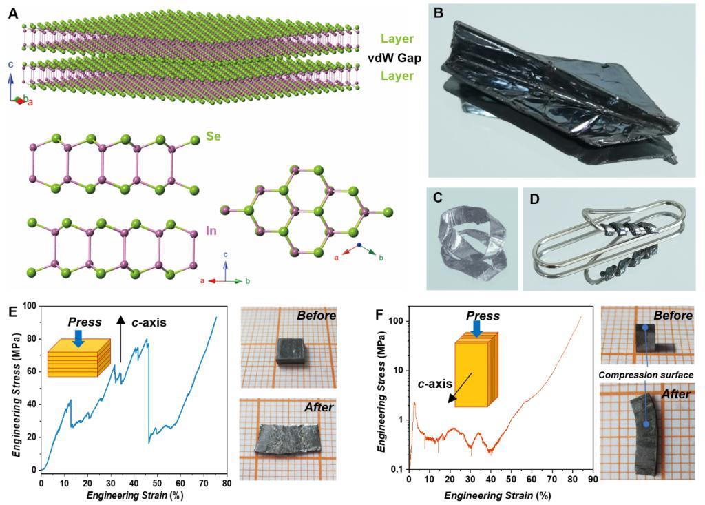 圖1. InSe單晶塊體的超常塑性。(A)晶體結(jié)構(gòu);(B-D)樣品可折疊或彎曲成“紙飛機”、莫比烏斯環(huán)、螺旋圈等各種形狀而不破裂;(E)沿c軸與(F)垂直c軸方向壓縮的應(yīng)力-應(yīng)變曲線及壓縮前后樣品照片。