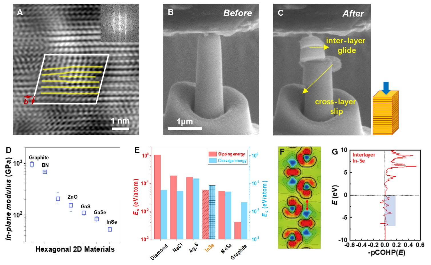 圖2 InSe塑性變形機制與機理。(A)刃位錯的反傅里葉變換掃描透射暗場像(IFT-DF-STEM);(B-C)掃描電鏡(SEM)下原位壓縮實驗,揭示了層間滑動與跨層滑移;(D)常見六方結(jié)構(gòu)二維材料的面內(nèi)楊氏模量;(E)滑移能與解理能;(F)差分電荷密度與(G)晶體軌道哈密頓分布密度(COHP),間接佐證了層間長程作用力的存在。