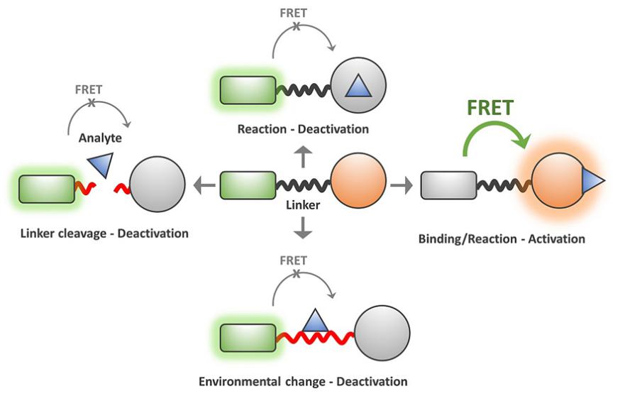 F?rster 共振能量轉移(F?rster resonance energy transfer, FRET)是根據理論物理學家Theodor F?rster命名,其在1948年提出了關于從能量供體到受體的電子激發(fā)轉移效率的方程式。FRET是通過供體-受體之間長程偶極-偶極作用的一種非輻射能量轉移過程。在光激發(fā)下,電子激發(fā)態(tài)的供體能量能被轉移到基態(tài)的受體。當供體和受體都是熒光團時,FRET經常被稱作“fluorescence resonance energy transfer”,即熒光共振能量轉移。