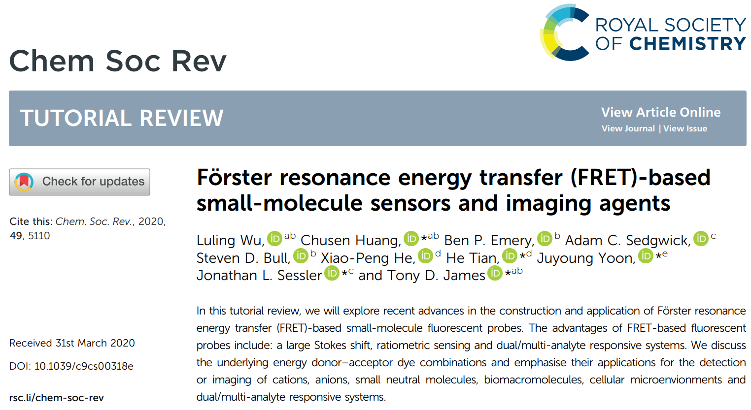 黃楚森教授向我們介紹,項目思路起源于其與英國巴斯大學Tony James教授的國際合作研究過程,由我院培養(yǎng)的碩士畢業(yè)研究生吳廬陵同學恰于James教授課題組攻讀博士學位。討論相關課題時,大家談到目前FRET綜述的文獻已難跟上最新進展,有必要對近幾年國際上相關最新研究進行總結。為此,在James教授指導下,基于課題組在FRET探針方面的良好前期研究積累,與華東理工大學,美國德克薩斯大學奧斯汀分校、韓國梨花女子大學等國內外高校合作共同撰寫完成了該綜述??紤]到有機小分子熒光探針領域近幾年的研究發(fā)表的論文基數(shù)很大,綜述僅挑選了最具代表性的研究成果作為具體實例進行設計原理和應用的闡述。