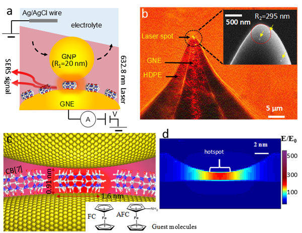 該團(tuán)隊(duì)基于葫蘆脲分子與金屬和客體分子的結(jié)合特性,將客體分子引入葫蘆[7]脲(CB[7])與金電極構(gòu)建的“分子結(jié)”,發(fā)展了主客體相互作用的拉曼信號(hào)和隧道電流信號(hào)研究新方法。該團(tuán)隊(duì)創(chuàng)造性地構(gòu)建了金納米顆粒-葫蘆脲分子-金納米電極(NPoNE)模型,可以有效增強(qiáng)葫蘆脲的C=O的拉曼信號(hào),正電壓可以有效增強(qiáng)金原子與羰基之間的相互作用??腕w分子可以影響“分子結(jié)”的穩(wěn)定性,也可以觀察到客體分子在葫蘆脲空腔內(nèi)的“翻轉(zhuǎn)”運(yùn)動(dòng)。研究表明,表面增強(qiáng)拉曼光譜技術(shù)(SERS)可以作為有效方法,監(jiān)測(cè)主客體動(dòng)態(tài)相互作用。研究論文“Observing Dynamic Molecular Changes at Single-Molecule Level in a Cucurbituril Based Plasmonic Molecular Junction”(https://doi.org/10.1039/D0NR03360J)在《Nanoscale》雜志發(fā)表。我校博士研究生艾秋爽和周疆豪為該論文的共同第一作者,常帥教授、梁峰教授與美國(guó)佛羅里達(dá)國(guó)際大學(xué)何勁教授為該論文的通訊作者。