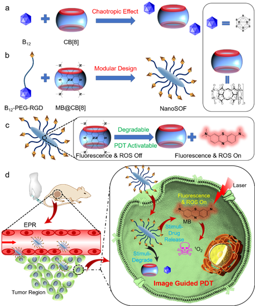 受到“樂(lè)高”模塊化設(shè)計(jì)理念的啟發(fā),在分子科學(xué)中,超分子化學(xué)通過(guò)非共價(jià)鍵作用實(shí)現(xiàn)了分子積木的可逆自組裝。其中,超分子框架以其周期性的多孔結(jié)構(gòu)、較大的比表面積等特點(diǎn),在氣體吸附與分離、催化及生物醫(yī)藥等領(lǐng)域展現(xiàn)出了廣泛的應(yīng)用前景。該團(tuán)隊(duì)通過(guò)二十面體硼簇(B12)與葫蘆[8]脲(CB[8])之間獨(dú)特的“離液效應(yīng)(chaotropic effect)”,制備了一種分子積木型超分子框架材料,并將其應(yīng)用于智能光動(dòng)力學(xué)治療,極大地提升了超分子框架材料的制備效率和應(yīng)用范圍。該研究通過(guò)模塊化的設(shè)計(jì)理念,在分子層面上制備具有多種功能的超分子自組裝體,對(duì)于同類多功能材料的開發(fā)和應(yīng)用有著重要的啟示作用。研究論文“Modular Design of Supramolecular Organic Frameworks for Image-Guided Photodynamic Therapy”(https://doi.org/10.1002/adfm.202004452)在《Advanced Functional Materials》雜志發(fā)表。論文第一作者為青年教師王雯靜,通訊作者是劉思敏教授、“生物物理化學(xué)與催化團(tuán)隊(duì)”劉義教授和“先進(jìn)材料與人工智能微生物團(tuán)隊(duì)”王曉強(qiáng)教授。