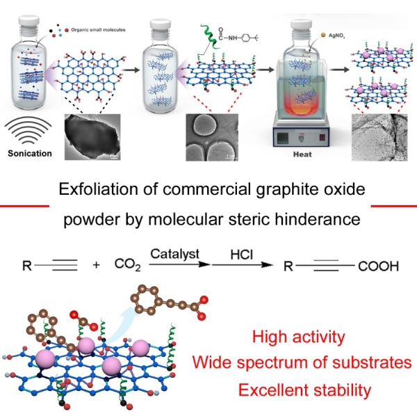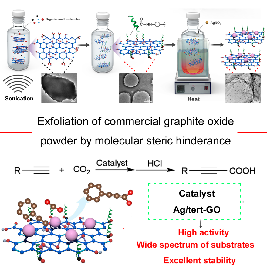 基于二維材料的復(fù)合催化劑近來受到極大關(guān)注。這些催化劑的優(yōu)點包括充分暴露的活性位點,增強(qiáng)的物質(zhì)傳遞速率,更重要的是具有清晰的表界面。然而,特別是對于廉價易得的氧化石墨粉末,難以制備具有均一形貌可控的二維材料復(fù)合催化劑。因此,唐智勇課題組通過在超聲過程中加入叔丁基對苯胺分子與氧化石墨(GO)粉末中的羧基反應(yīng),成功開發(fā)出空間位阻,能夠有效剝離以及大量生產(chǎn)超薄ter-GO氧化石墨烯納米片(見圖1)。更重要的是,形成的酰胺鍵有利于捕捉二氧化碳,氧化石墨烯表面豐富的羥基和環(huán)氧基則起到了穩(wěn)定保護(hù)銀納米粒子作用。結(jié)果,在40 ℃和常壓條件下,合成的Ag/ ter-GO24小時內(nèi)有效地催化了苯乙炔轉(zhuǎn)化為苯丙酸,轉(zhuǎn)化率達(dá)到97.2%,催化劑的轉(zhuǎn)化頻率高達(dá)3.12 h -1。