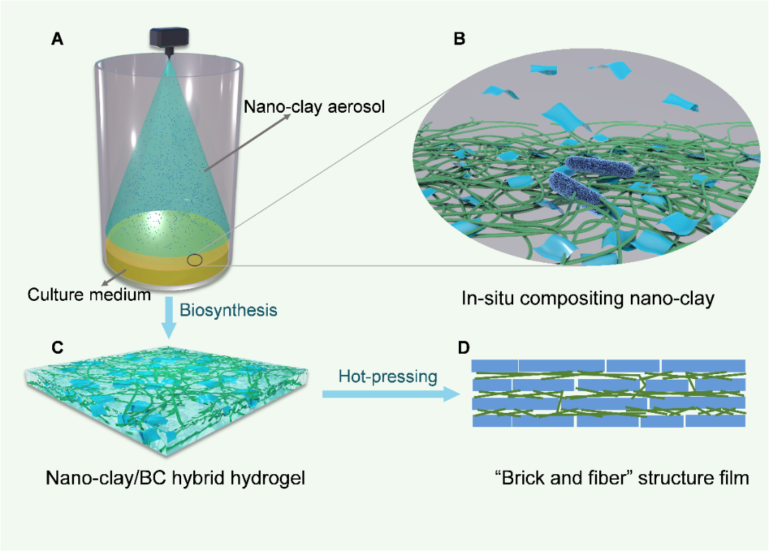 圖1. 高性能可持續(xù)仿貝殼透明薄膜的制備過程與結(jié)構(gòu)示意圖。(A-B) 常溫常壓下微生物輔助合成復(fù)合水凝膠的過程。(C) 具有三維納米纖維網(wǎng)絡(luò)結(jié)構(gòu)的復(fù)合水凝膠。(D) 高性能可持續(xù)仿貝殼透明薄膜內(nèi)部的“磚-纖維”結(jié)構(gòu)。