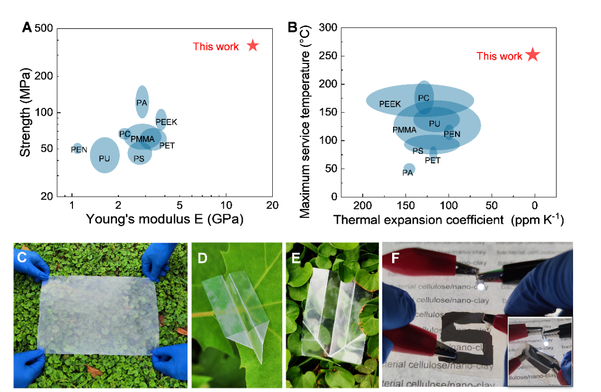 圖2. 該薄膜與多種傳統(tǒng)塑料強(qiáng)度、模量、最高服役溫度和熱膨脹系數(shù)的Ashby圖。(A) 強(qiáng)度和模量Ashby圖,表明該薄膜具有優(yōu)于傳統(tǒng)塑料的強(qiáng)度和模量。(B) 最高服役溫度和熱膨脹系數(shù)Ashby圖,表明該薄膜具有優(yōu)于傳統(tǒng)塑料的最高服役溫度和熱膨脹系數(shù)。(C) 該薄膜的大尺寸樣品。(D-E) 該薄膜可以被折疊成各種形狀,且多次折疊后展開無明顯損傷。(F) 在展開和彎折的情況下,該薄膜上的電路都可以保持暢通,使LED燈亮。